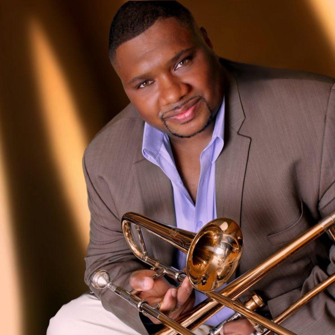 Wycliffe Gordon boasts an impressive career touring the world, performing to great acclaim from audiences and critics alike. The Jazz Journalists Association named him 2020 “Trombonist of the Year” for the record-breaking 13th time, and he has topped Downbeat Critics Poll for “Best Trombone” again an unprecedented six times (2020, 2018, 2016, 2014, 2013 & 2012). Last year, he was the recipient of the “Louie Award,” the International Trombone Award and the Satchmo Award, among others. Wycliffe is a prolific recording artist and is extremely popular for his unmatched signature sound, plunger technique, and unique vocals. He can be heard on hundreds of recordings, soundtracks, live DVDs, and documentaries. Musicians and ensembles of every caliber perform his music throughout the world, and his arrangement of the theme song to NPR’s “All Things Considered” is heard daily across the globe.