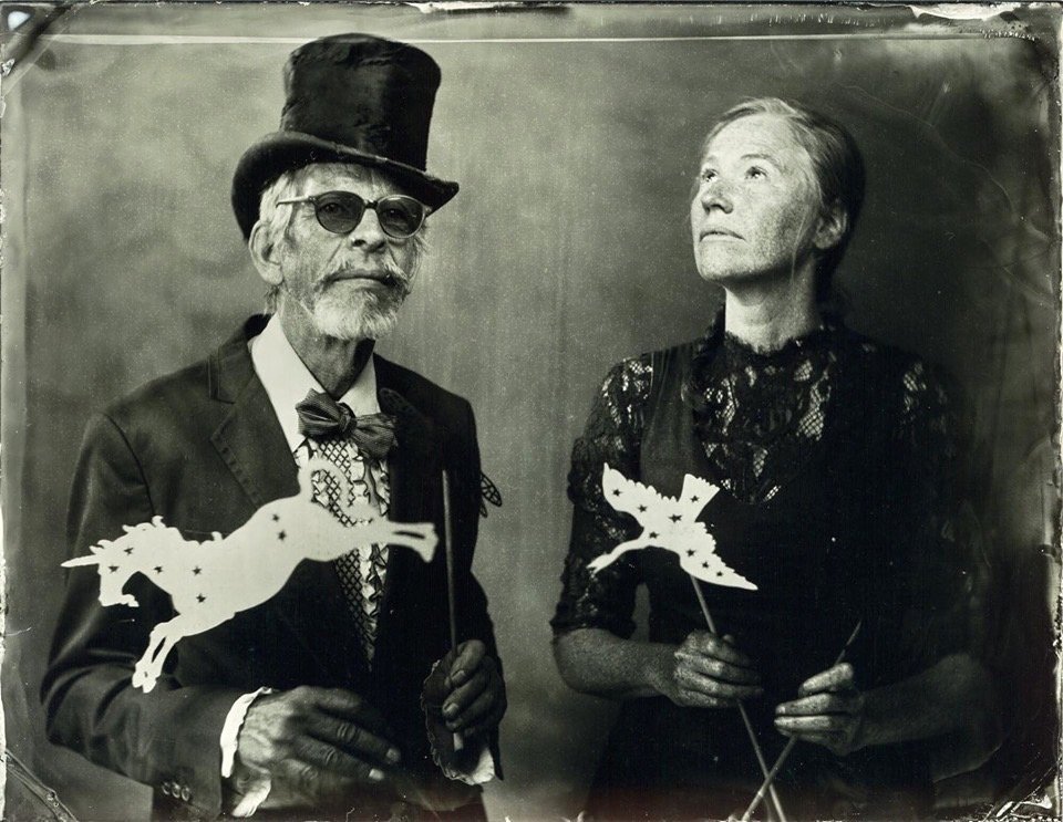 The Binoculars, of Brooklyn, New York, is the duo of longtime pals Kaethe and Chloë. Musically, they peer at long lost tunes from around the world using fiddle, guitar, lap steel, and laser vocal harmonies. Their collaborations span mediums-- from textile (leather, collected fabrics) to edible (fermentation, popcorn), and now Crankies, always bringing their unique stamp and care for handmade storytelling.